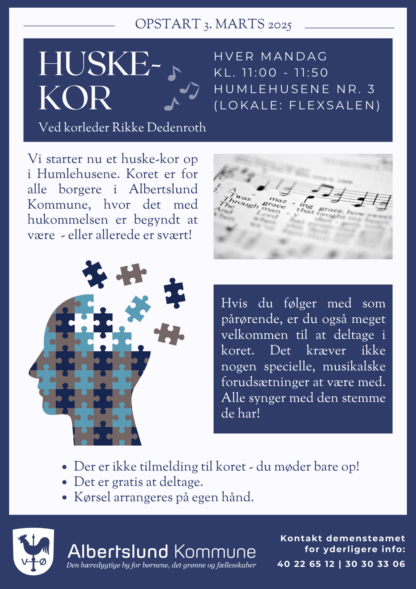 Vi starter nu et huske-kor op i Humlehusene. Koret er for alle borgere i Albertslund Kommune, hvor det med hukommelsen er begyndt at være - eller allerede er svært!